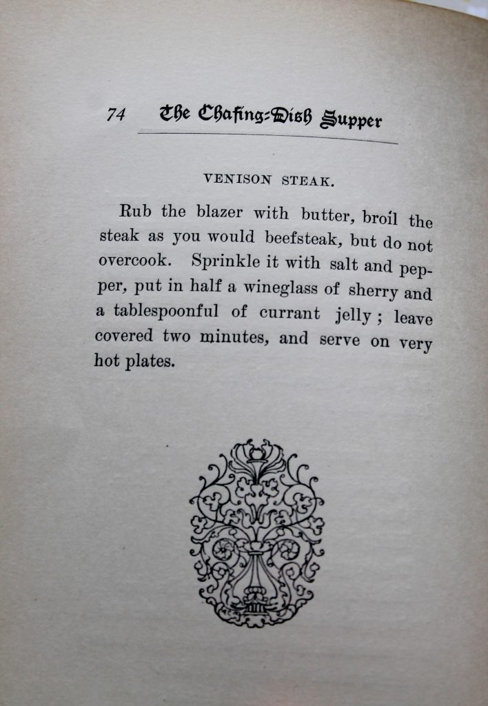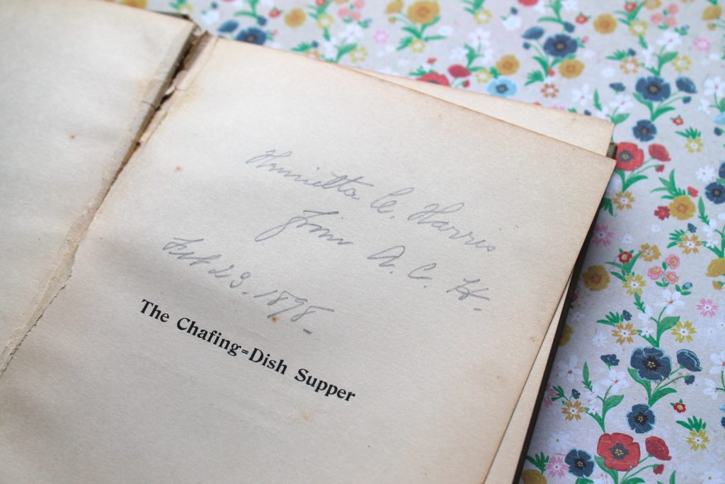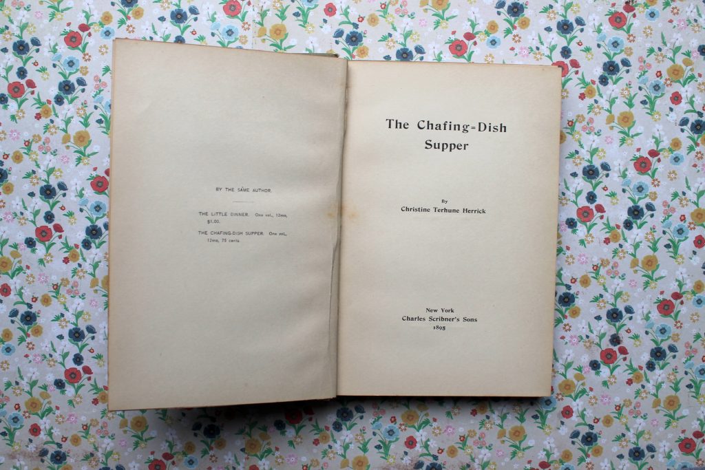 The Chafing-Dish Supper was written by Christine Terhune Herrick and first published around 1894 by Scribner’s. She was a writer and journalist who wrote prolifically about homemaking.